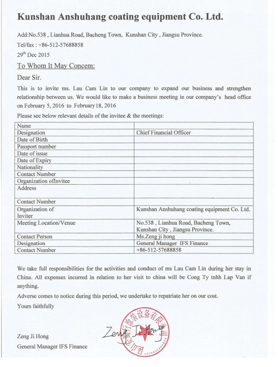 - Lưu ý: Trên thư mời chỉ thể hiện thông tin của công ty Việt Nam và Trung Quốc, không được để bất cứ thông tin gì liên quan đến Tổng Lãnh Sự Quán Trung Quốc.